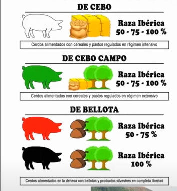 3つの条件を全部クリアしているのは、イベリコ豚と言われるもの中で5%に過ぎません。3条件で3 つのタイプ:1)品種だけだったり(下図上)、2)品種と森で育てるだけだったりして(下図中)、3)3条件すべてクリア(下図下の図)があるそうです。その3条件クリアしても、イベリコ種100%と50%以上に分けられるそうです。詳しくは種豚ページで。